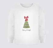 Disegno di un pino verde con neve e un fiocco rosso con citazione di Natale