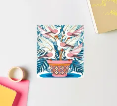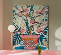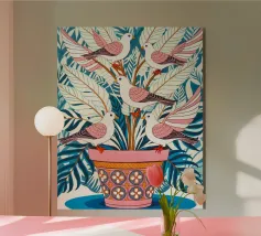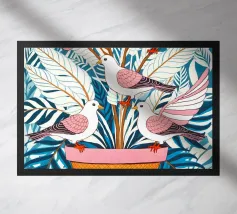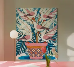 Uccello, Pittura, Disegno, Becco, Illustrazione, Arti creative, Piuma, colomba, piccione, pastello, verde acqua, rosa, pianta d'appartamento, piante, botanica, vaso di fiori, natura, animali, uccelli