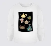 È esposta una collezione di sei estrose teiere, ciascuna decorata con motivi floreali e di frutta unici. I disegni presentano forme e colori diversi, creando un tema giocoso e affascinante.