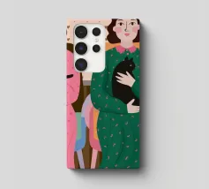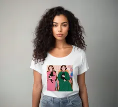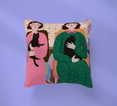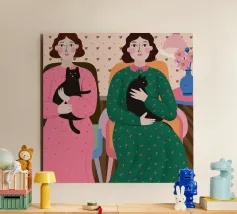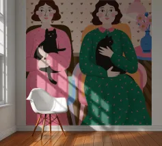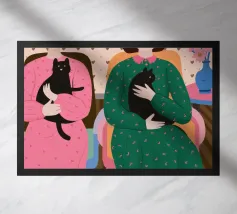 Due donne elegantemente vestite, una in rosa e l'altra in verde, stanno insieme, ognuna con un gatto nero in mano, celebrando l'amicizia e l'amore comune per i felini.