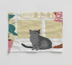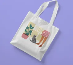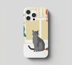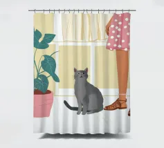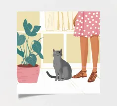Una tranquilla scena domestica cattura un gatto grigio seduto pazientemente accanto alle gambe del suo padrone, mostrando un semplice e tenero momento di compagnia tra un umano e il suo amato animale domestico.