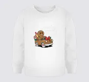 Un allegro omino di pan di zenzero guida una macchinina decorata con oggetti festosi come bastoncini di zucchero e agrifoglio. La frase "Dashing through the Dough" aggiunge un tocco giocoso al tema delle feste.