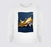 Una composizione astratta che mostra onde dinamiche di oro e argento, intrecciate con spruzzi vibranti su uno sfondo blu profondo, ideale per sfondi desktop e sfondi artistici.