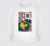 Una donna si accoccola su un divano verde, immersa in un libro e con una tazza di tè vicino. La stanza è decorata con piante e opere d'arte, creando una scena perfetta di confortevole solitudine e fuga intellettuale.