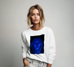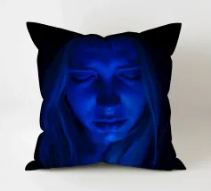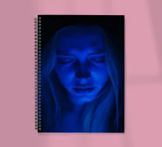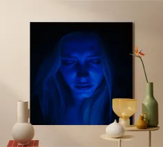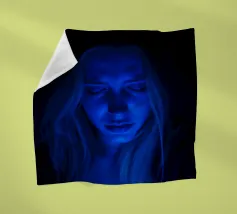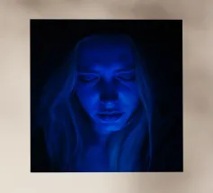 Una donna con i capelli lunghi siede tranquillamente in uno spazio buio, illuminato da un'intensa luce blu. I suoi occhi sono chiusi e sembra essere immersa in un pensiero o in una riflessione in un ambiente atmosferico.