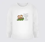 Due simpatici capibara siedono pacificamente su un coccodrillo verde, con accanto la frase scherzosa "Don't Worry Be Capy".