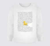 Una solare anatra gialla con il becco rosa scivola in un campo di punti neri disegnati a mano. Minimale, giocoso e moderno: un disegno monocromatico con un allegro tocco di colore.
