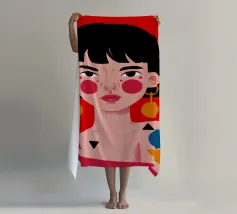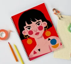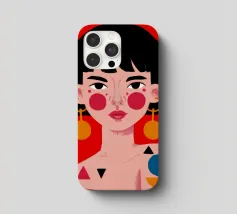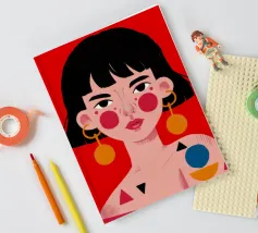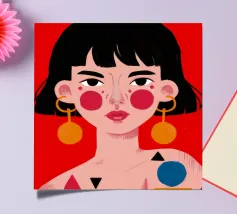 Questo dipinto raffigura una persona con i capelli neri che indossa un abito colorato con forme geometriche. Lo sfondo è rosso e la persona è adornata con grandi orecchini circolari.