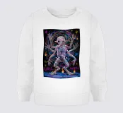 Una figura scheletrica con arti allungati irradia energia cosmica mentre forme vorticose la circondano. Luminosi motivi al neon arricchiscono la composizione surreale e fluida.