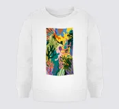 Una composizione astratta alta e stretta, piena di forme e motivi di foglie colorate sovrapposte, che suggerisce una fetta vibrante di una fitta giungla verticale.