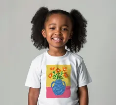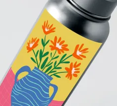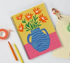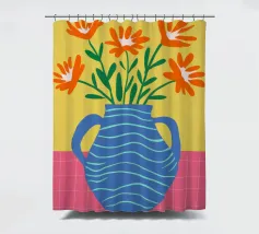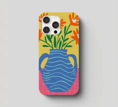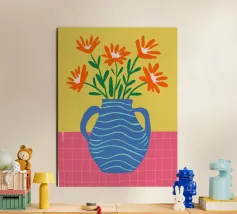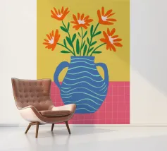 Un'illustrazione semplice e allegra di un bouquet di fiori arancioni in un vaso blu a righe ondulate su uno sfondo giallo sole. L'opera d'arte è luminosa e allegra, con un'affascinante sensazione di disegno a mano.