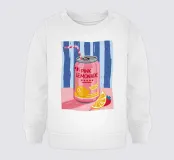 Una lattina di "Pink Lemonade" è illustrata in un vivace stile pop art, completa di condensa, cannuccia spumeggiante, fetta di limone fresco e fragola.