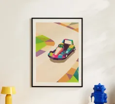 Illustrazione di un go-kart minimalista su una pista con uno stile geometrico moderno.