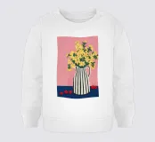 Una natura morta moderna e grafica di un bouquet di fiori gialli brillanti in un vaso a righe bianche e nere di grande effetto. Lo sfondo rosa tenue crea un delicato contrasto con i motivi e i colori audaci.