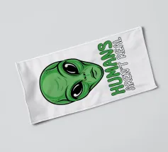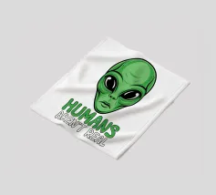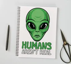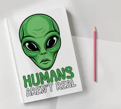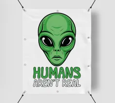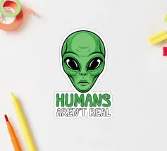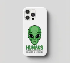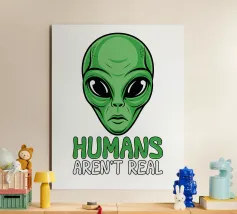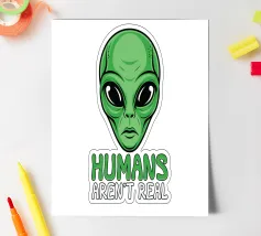 Un alieno verde con grandi occhi neri si staglia su uno sfondo verde scuro, accompagnato dal testo umoristico "Gli umani non sono reali".
