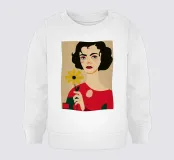 Elegante ritratto stilizzato di una donna con capelli scuri e arricciati e un vistoso rossetto rosso, che tiene in mano un fiore giallo in stile Art Déco.