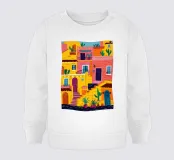 Un'illustrazione vibrante e dettagliata di una città collinare simile a un labirinto, con case colorate, scale e piante ovunque. La scena è una rappresentazione gioiosa, energica e complessa di una vivace comunità mediterranea.