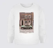 In una pittoresca strada di Londra, un'elegante auto d'epoca passa davanti a facciate di mattoni con un'atmosfera retrò e senza tempo dell'architettura britannica, mescolando storia e nostalgia urbana.