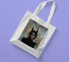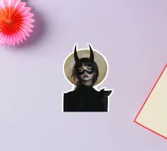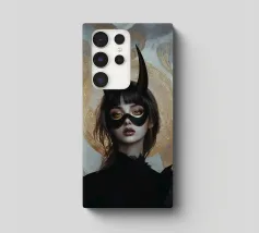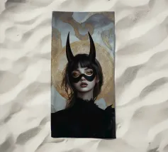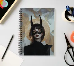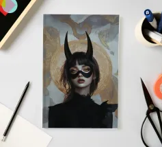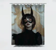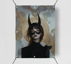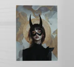 Un ritratto accattivante di una donna che indossa una maschera nera e corna, evidenziato da un'aureola dorata luminosa e da uno sfondo astratto e strutturato, che crea un'atmosfera mistica ed enigmatica.