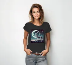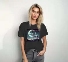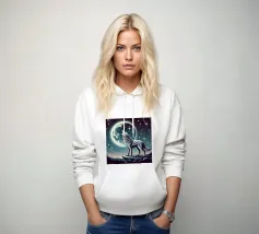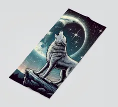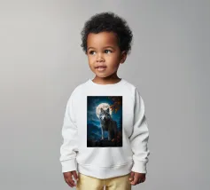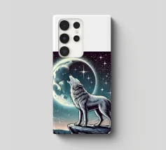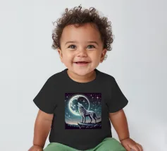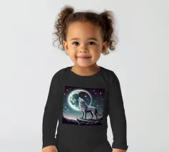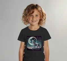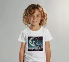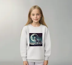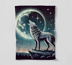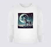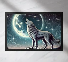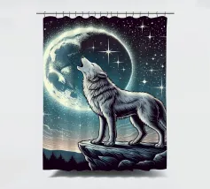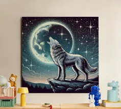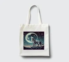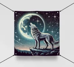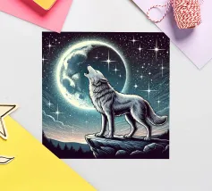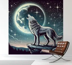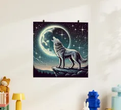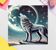 Una splendida illustrazione in stile cartoon di un maestoso lupo argentato che ulula alla luna crescente sotto un cielo stellato. Il lupo, con la sua pelliccia scintillante, si erge fiero su una sporgenza rocciosa, illuminata dalla luce della luna. La scena è ambientata in un cielo blu e nero profondo, pieno di stelle scintillanti, che evoca un senso di magia e serenità. La luna crescente brilla dolcemente, completando la presenza eterea del lupo. Alberi ombrosi e colline lontane completano l'atmosfera tranquilla e mistica.