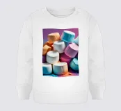 Una varietà di marshmallow colorati sono disposti in modo disordinato, creando una disposizione invitante e giocosa con uno sfondo luminoso e schizzato che esalta l'atmosfera allegra.