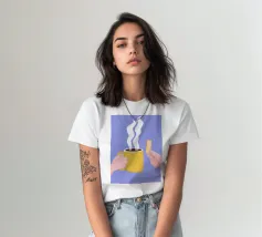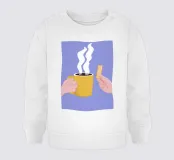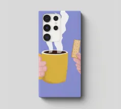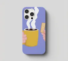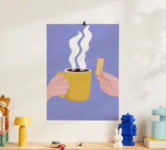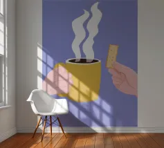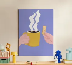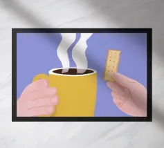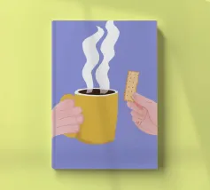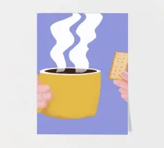 Un'illustrazione semplice e confortante di una mano che tiene una tazza gialla e calda di caffè o tè fumante, con un biscotto pronto per essere inzuppato. L'immagine cattura perfettamente il piacere semplice e tranquillo di un rituale mattutino.