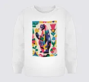 Un orso colorato in piedi tra vari fiori e piante astratte. L'orso è raffigurato in modo stilizzato con forme geometriche e colori vivaci.