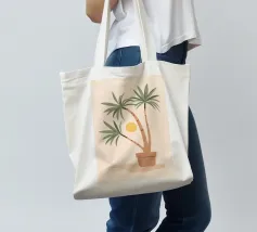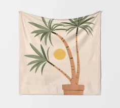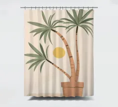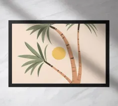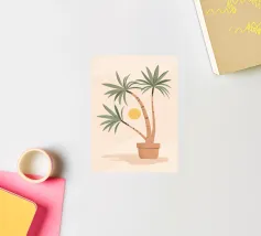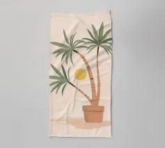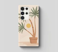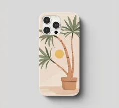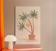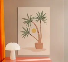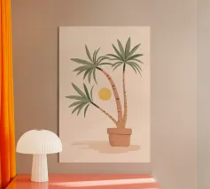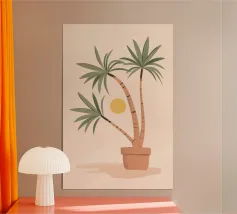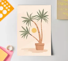 Illustrazione minimalista e chic di una palma in vaso su un morbido sfondo beige. Le linee pulite e la composizione semplice ne fanno un'opera d'arte botanica elegante e senza tempo.