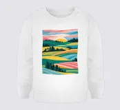 Un dipinto paesaggistico espressivo e vibrante di campi ondulati, simili a patchwork, nei toni del verde, del giallo e del rosa. Lo stile pittorico cattura la bellezza dinamica e la consistenza della campagna.