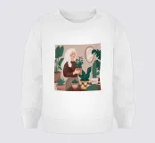 Una donna anziana cura le sue piante in una stanza dai toni tenui, esprimendo saggezza, calma e un legame senza tempo con la natura.