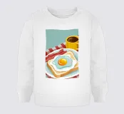 Un classico piatto da colazione con un uovo al sole su pane tostato, bacon e una tazza di caffè. L'illustrazione ha un fascino confortante e appetitoso.