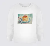 Illustrazione colorata di una pila di pancake sormontati da ciliegie su un piatto decorativo, su uno sfondo pastello.
