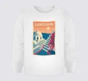 Questo poster vintage di Santorini illustra il fascino unico dell'isola greca con le sue case bianche, la cupola blu e le bouganville in fiore sul bordo del Mar Egeo. Un poster mediterraneo luminoso che invita al viaggio e al relax.