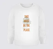 Un poster tipografico colorato con il testo This Must be the Place in giallo su sfondo beige. L'arte murale colorata è la scelta perfetta per ravvivare la vostra casa.