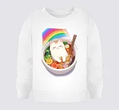 Adorabile gatto bianco comodamente seduto in una ciotola di ramen, circondato da uno stravagante arcobaleno.