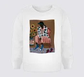 Questa opera d'arte mostra una persona seduta su una sedia a righe, circondata da girasoli e da una borsa verde. Lo sfondo è di un marrone tenue che crea un'atmosfera rustica e riflessiva.
