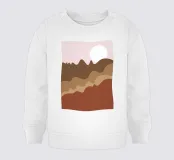 Sfumature stratificate di marrone e beige creano un paesaggio stilizzato con un grande sole o una luna che sorge sullo sfondo. Le linee curve suggeriscono colline o montagne, evocando una scena desertica serena e astratta.