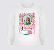Illustrazione di una donna che guarda il suo riflesso in uno specchio ornato, circondata da vari prodotti di bellezza su un bancone del bagno. La scena è un'istantanea chic, intima ed elegante di una routine di bellezza quotidiana.