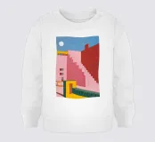 Un'opera architettonica di grande effetto, con una lunga scala rosa che sale verso un sole o una luna gialli e luminosi in un cielo blu scuro. La composizione è audace, minimalista e fortemente simbolica.