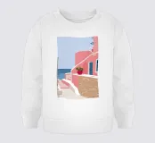 Una classica scena mediterranea che raffigura un edificio rosa con una scala che scende verso un tranquillo mare blu. Quest'opera d'arte cattura perfettamente il fascino solare e pacifico di un'isola greca.