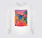 Una vista mozzafiato su una vibrante scalinata mediterranea, fiancheggiata da edifici colorati e palme rigogliose. La prospettiva attira lo sguardo verso l'alto, verso un cielo luminoso, creando un senso di ottimismo, avventura e il sogno di una perfetta fuga estiva.