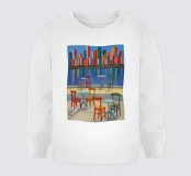 Sedie luminose si sparpagliano sulla terrazza di un caffè in riva al mare, proiettando lunghe ombre nella prima luce.