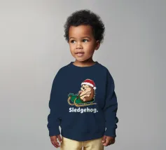 Un simpatico riccio con un cappello da Babbo Natale siede allegramente su una slitta ornata di agrifoglio. Sotto la slitta, la scritta "SLEDGEHOG" aggiunge un tocco giocoso al tema della festa.