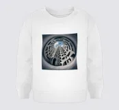 Un progetto architettonico fantasioso che mostra una struttura circolare in cemento vista dal basso, enfatizzando simmetria, profondità e creatività. Il design urbano futuristico crea un'esperienza visiva surreale con le sue forme geometriche e il cielo aperto.