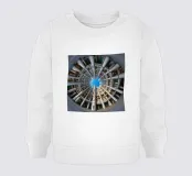 Un suggestivo disegno architettonico circolare caratterizzato da file concentriche di alte colonne ed edifici interconnessi. La prospettiva fisheye enfatizza la simmetria geometrica e si apre su un cielo azzurro e limpido, creando una scena urbana suggestiva e coinvolgente.