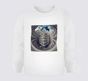 Una prospettiva fisheye surreale che mostra una torreggiante architettura gotica futuristica con dettagli intricati e motivi simmetrici, sullo sfondo di un cielo blu vibrante con nuvole drammatiche. L'immagine evoca la modernità mescolata a elementi di design classico.