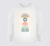 Una composizione geometrica presenta varie forme, tra cui un semicerchio che ricorda il sole, cerchi concentrici e archi in tenui tonalità pastello. Il disegno è simmetrico e bilancia gli elementi visivamente attraenti.
