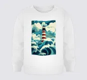 Un faro a strisce bianche e rosse si erge resistente tra onde tumultuose sotto un cielo drammatico. La scena emana un senso di forza e perseveranza contro i potenti elementi della natura.