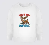 Una renna dei cartoni animati ha un'aria affannata mentre รจ impigliata in un filo di luci natalizie colorate. Sopra e sotto la renna, il testo recita "THIS IS HOW" e "HOW I FEEL" a caratteri rossi e blu.