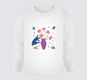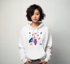 Illustrazione minimalista ed elegante di una mano blu scuro che dispone delicati fiori e foglie rosa in un vaso viola.